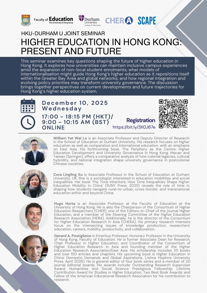 This seminar examines key questions shaping the future of higher education in Hong Kong. It explores how universities can maintain inclusive campus experiences amid the expansion of non-local student enrolments; what models of internationalisation might guide Hong Kong’s higher education as it repositions itself within the Greater Bay Area and global networks; and how regional integration and evolving policy priorities may transform university governance. The discussion brings together perspectives on current developments and future trajectories for Hong Kong’s higher education system.