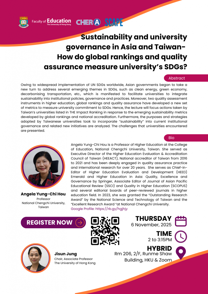 Owing to widespread implementation of UN SDGs worldwide, Asian governments began to take a new turn to address several emerging themes in SDGs, such as clean energy, green economy, decarbonising transportation, etc., which is manifested to facilitate universities to integrate sustainability into institutional policies, governance and practices. Moreover, two quality assessment instruments in higher education, global rankings and quality assurance have developed a new set of metrics to measure university commitment to SDGs. Hence, the lecture will focus actions taken by Taiwan’s universities listed in THE Impact Ranking in response to the emerging sustainability metrics developed by global rankings and national accreditation. Furthermore, the purposes and strategies adopted by Taiwanese universities took to incorporate “sustainability” into current institutional governance and related new initiatives are analyzed. The challenges that universities encountered are presented.